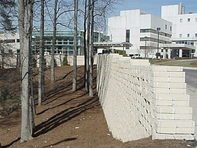 A major feature of this project included the construction of a 15 foot high segmental retaining wall with a vehicular / pedestrian barrier parapet to preserve the natural area in front of the Cancer Center.